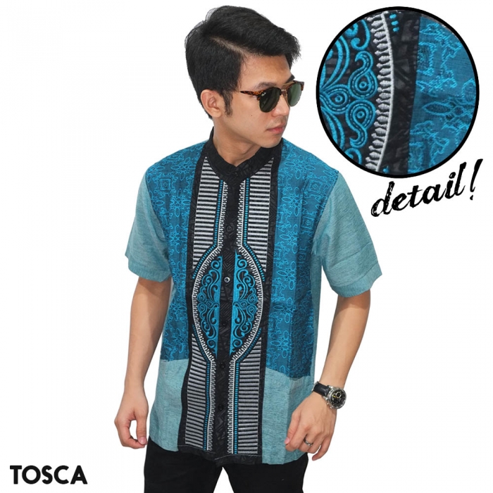 Baju Koko Pendek Modern Bordir Garis Tosca