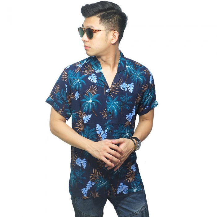 Kemeja Pendek Revere Collar Hawaii Coconut Tree Navy